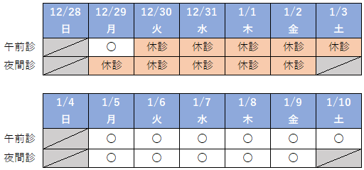 年末は、12月29日(月)の午前診までです(夜間診はありません。) 年始は、1月5日(月)から通常の診療を行います。